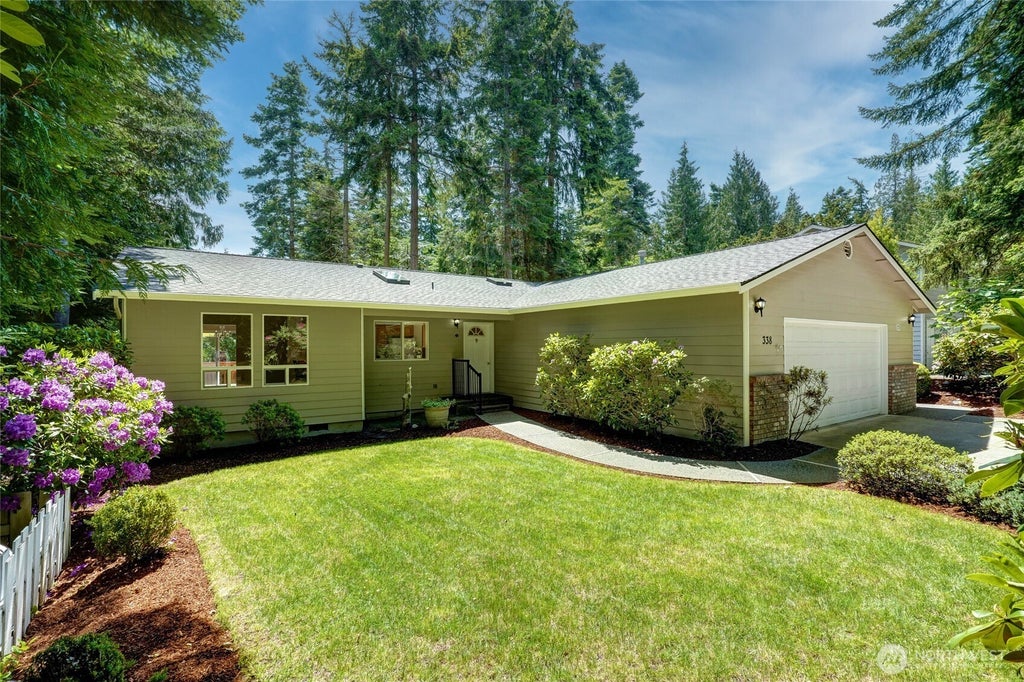 Welcome to this beautifully maintained 3-bedroom, 2-bath home nestled in the serene Shelter Bay community. Enjoy the peaceful privacy of a quiet location with a greenbelt on two sides, enhancing the natural beauty and sense of seclusion. The home features vaulted ceilings, skylights, and a cozy fireplace in a well-designed layout that flows effortlessly to a multi-level, expansive deck—perfect for outdoor living and entertaining. Thoughtfully landscaped with mature plantings for year-round color and curb appeal. Oversized garage offers ample storage with built-in shelves and room for a workbench. Shelter Bay amenities include a newly renovated Pool, Marina, Par 3 Golf, Pickleball, Tennis, Beaches, Parks, and more. Leased land.