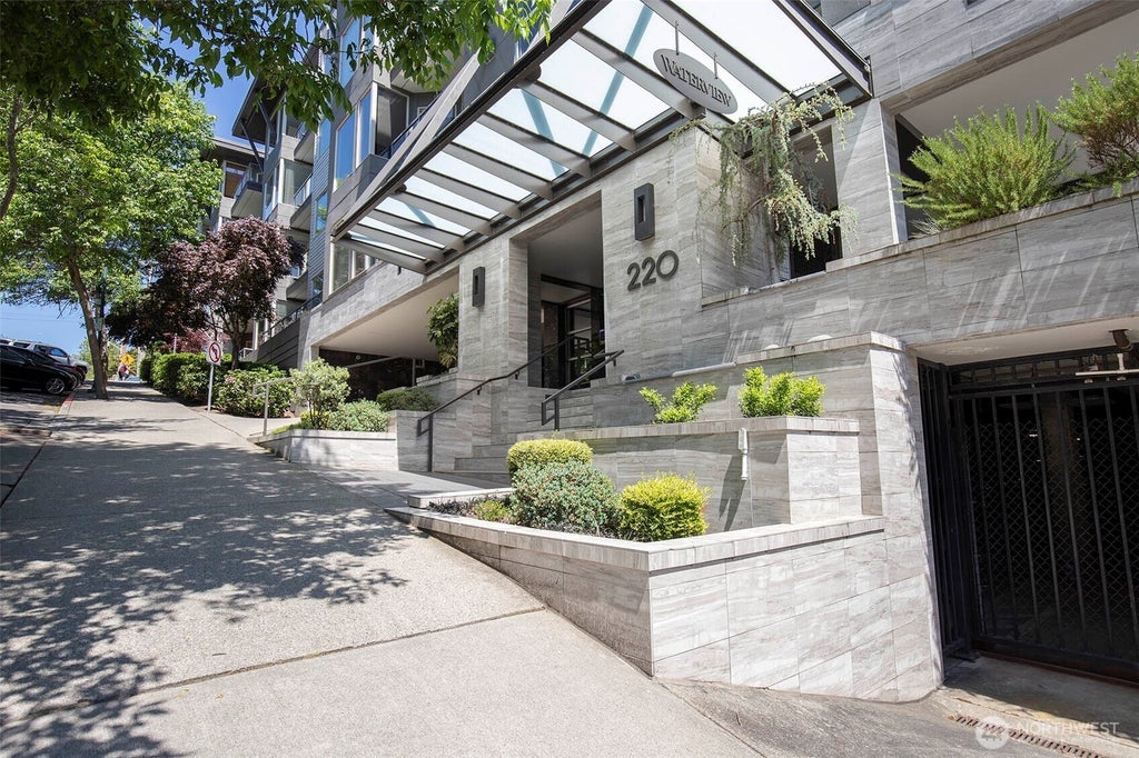 Perched on the 4th floor of the Waterview Condos, this private & quiet end unit offers lake, city, and territorial views from the living area & private deck. This elegant 2-bedroom 2 bath condo has hardwood flooring throughout & open living & dining area that flows to updated kitchen w/ granite counters, SS appliances & large eating bar. Primary suite is a true retreat w/ custom closet built-ins & a spa-like bath w/ marble floors and marble walls. 2nd bedroom fits a queen bed or makes an ideal home office. 2nd full bath w/ marble finishes. Amenities include secure Lobby entrance, Fitness center, 2 parking spots in garage. New elevator & roof. Live steps from waterfront parks, shopping, dining, & everything downtown Kirkland has to offer!
