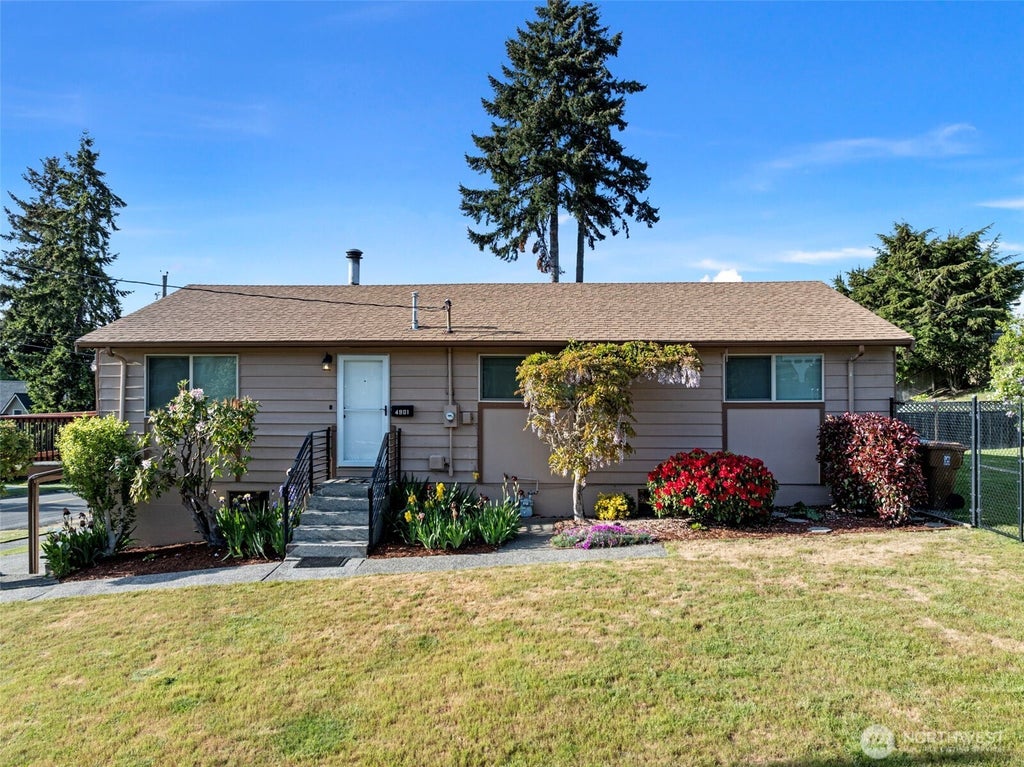 Adorable North Tacoma home with partial water view, minutes from Point Ruston, the waterfront, and Point Defiance Park! Move-in ready, with brand new laminate flooring, bedroom carpeting and freshly painted interior. New roof installed in Oct of 2022 & new low maintenance Trex deck built in July 2021.Three bedrooms plus full bathroom on main floor. Basement is finished with a large bonus room, including a built-in countertop & bar area, built in bookshelves, lots of storage & a laundry room. Enjoy a fully fenced, large back yard, lots of garden space and plenty of parking. Spacious two car garage plus shop area is a huge bonus. Just two blocks away from the cutest friendly neighborhood market!