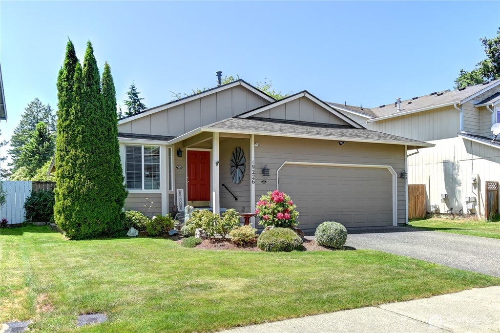 You'll love the comfort and convenience of this charming one-level home in a quiet, gated community. Enjoy open, airy spaces with vaulted ceilings and a cozy corner gas fireplace that’s perfect for relaxing evenings. The kitchen is a true hub of the home, featuring a central island with seating and plenty of cabinet space for all your cooking needs. The roomy primary suite offers a peaceful retreat with a 5-piece bath, walk-in closet, and private access to the backyard. All appliances are included, with a new roof in 2020 and a 1-year home warranty, it’s truly move-in ready! Plus, you're just minutes from schools, shopping, JBLM, and a lovely community park right down the street. Come see why this could be your perfect home!