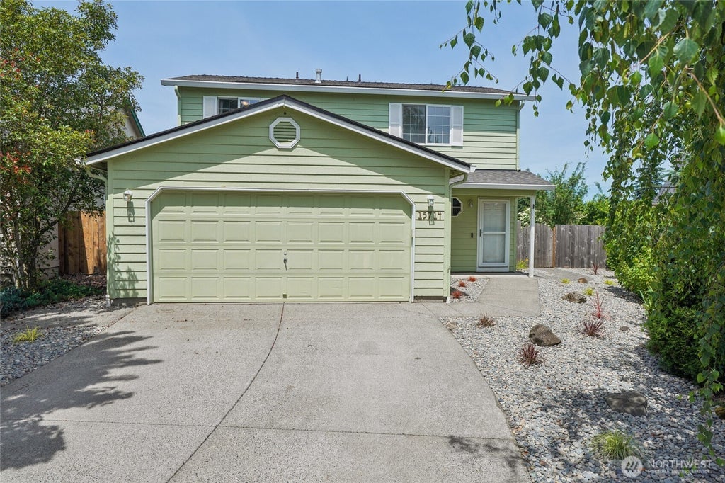 Welcoming covered front porch. Main living area embraces a great rm family rm w/laminate flooring. Breakfast bar SS kitchen w/dishwasher, microwave, glass cooktop range, ample cabinetry w/space above for accessories, pantry, recessed light, and vinyl floor. Separate dining area with laminate floor and slider to patio. Upstairs, the primary en-suite offers a walk-in closet, carpet, single sink vanity, shower, and vinyl floor. 2 addtl upper-level bedrooms. Full bath with a single sink vanity, combo soak tub and shower also upstairs. Main level laundry room with a barn-style door, vinyl floor, and a nearby powder room with a single sink vanity. A 2-car garage, large lot, and patio. Mortgage savings may be available for buyers of this listing.