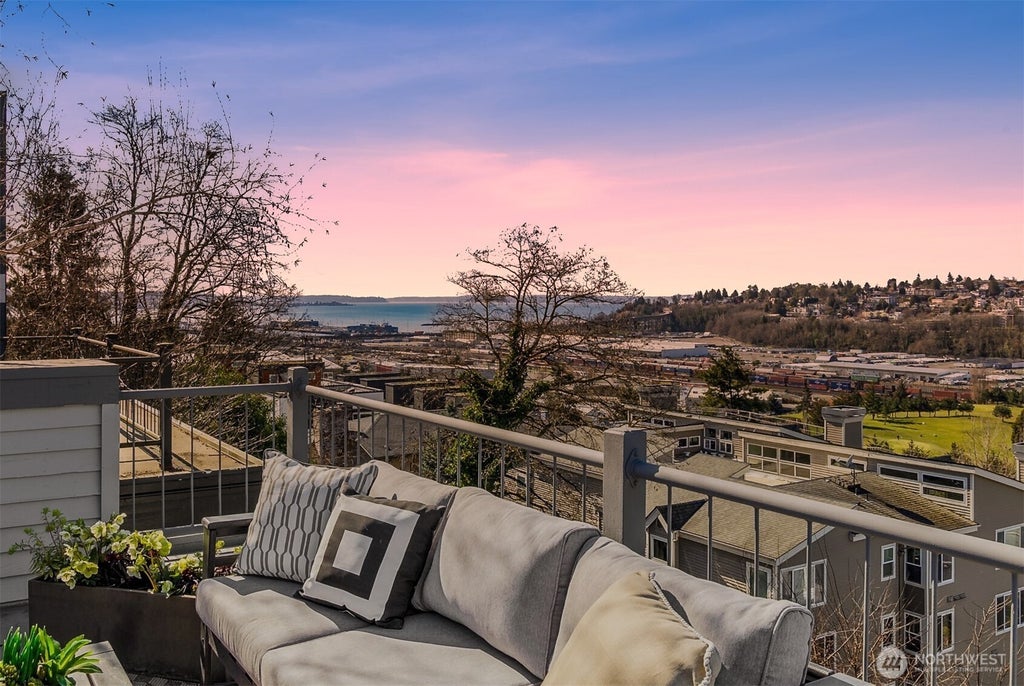 Celebrate summer on your nearly 600 sq foot roof top, view deck. Perfectly positioned to support life/work balance, this classic contemporary, w/ lovely views, is moments to shopping, dining, recreation & minutes to Expedia, Downtown & SLU. Level entry opens to warm & inviting main floor – enjoy an open & airy floor-plan, soaring ceilings, newly refinished hardwood flrs & plenty of space to relax & gather with friends. Upstairs, your oasis awaits. Truly spacious primary suite w/large 5pc BA & walk-in closet, and large, adjacent roof-top deck. Imagine - your perfect spot for morning yoga & evening dinners watching stunning sunsets over the Sound. Daylight lower-level features 2 additional, roomy BRs & full BA. Convenient att’d 1car garage.
