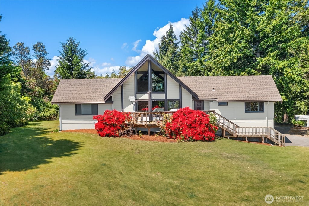 This stunning Lindal Cedar home boasts sweeping views of Puget Sound and majestic Mt. Rainier. With three spacious bedrooms, the primary suite features a generous layout, walk-in closet, en-suite bath—and, yes, a view to wake up to every morning! A versatile loft offers the perfect spot for a home office or additional living space, complete with its own bathroom and private deck. Downstairs, the expansive 1,400 sq ft basement—already plumbed for a bathroom—offers endless possibilities for future expansion. Set on over 2 sunny and private acres, the property includes established garden beds, fruit trees, and serene spaces to relax and soak in the natural beauty.