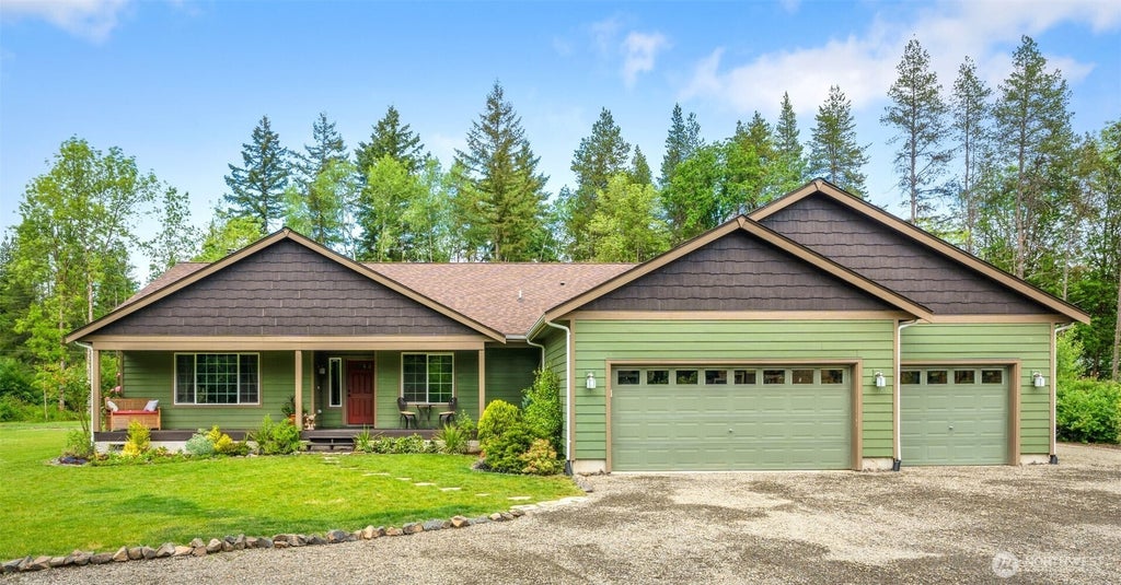 Motivated seller! Charming rambler with 3 large bedrooms, bonus office/den & 2 full bathrooms. Secluded living on 5 acres of trees and open pasture off a quiet country road. House boasts a spacious living room with vaulted ceilings, wood stove, new engineered bamboo flooring & plenty of natural light. Kitchen features island with bar seating, large pantry & stainless appliances that stay with the home. Master bedroom w/ walk in closet & master bath. Covered front & back decks, 3 car garage, fiber internet, raised garden beds, fire pit, wired for generator, heat pump A/C, fully fenced w/ entry gate and the trim & chicken coop are made from wood harvested and milled from the property. This picturesque setting has it all and is move in ready!