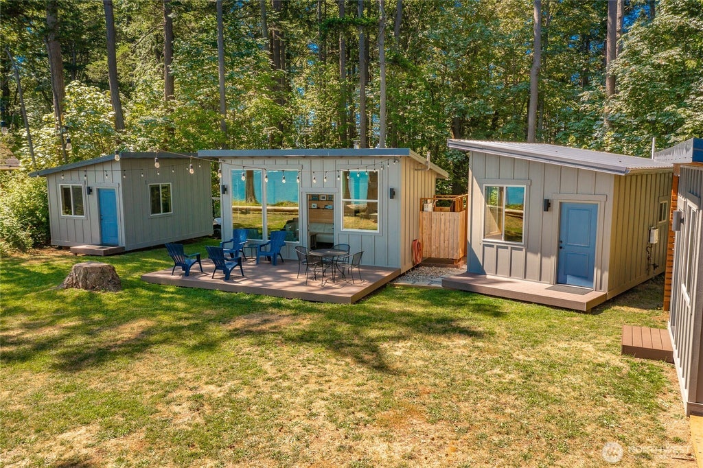 Welcome to your private island retreat just 8 miles from Bellingham—an unforgettable getaway on high-bank waterfront property! This cheerful compound includes three well-crafted cabins designed for relaxed island living. The main cabin features a propane kitchen and cozy living area with wood stove. The primary sleeping cabin includes a king bed, loft with twins, half bath, and propane heat. The guest cabin offers a queen bed and 5 bunks. A separate deck is ideal for tent camping. You'll also find an outdoor shower, second half bath, and storage shed. No short-term rentals—just pure island peace.