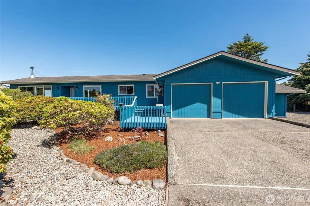 Water view home on fenced corner lot in Mains Farm! Established landscaping with huge rhododendrons frame this great single level home with oversized, 3 bay garage. Cozy living room w/woodstove with beautiful views north to the Dungeness Bay and Spit, the Strait of Juan de Fuca and Canada beyond. Another family room or office area, dining area off easy to maneuver kitchen plus a primary bedroom suite and another bedroom and 2nd full bath. Multiple decks - one at the entry, one with the view of the water and another more private deck protected from wind out back. Space to park an RV with hookup to power. Close to boat launch at Cline Spit and the hiking trails of the Dungeness Recreation area. Great home in a great walkable neighborhood.
