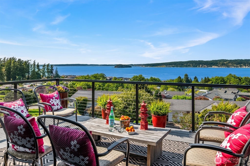 Expansive west-facing water views and just a short stroll to a private community beach—perfect for crabbing, kayaking, and soaking up the sun. This thoughtfully updated home features a view kitchen and open-concept living with a sleek linear modern fireplace in the great room and two main-level bedrooms. The lower level is designed for entertaining with a spacious family room, wood-burning fireplace, bar, and two additional bedrooms. At sunset, relax in the hot tub surrounded by lush gardens and a tranquil water feature. Double view decks are ideal for hosting and watching boats and whales pass by. Plenty of space for RV/boat parking, and the community boat launch is nearby. Prime North-end location with easy drive-on access to the island.