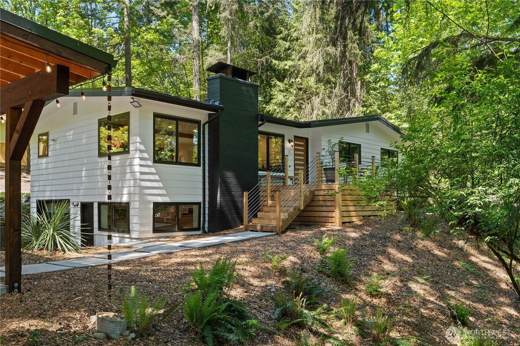 Top to bottom remodel just completed of this Mid Century Modern entertainers dream. Truly a Rare find w/ close in location to everything Woodinville & exceptional quality of finishes & modern updating with no expense spared. NEW NEW NEW: hardwood flooring, Black Viny Windows, 12’ Pella Clad OXXO Sliding patio doors, 5 panel Black int doors, Metal Roof, Mini Split heating and cooling HVAC, 3 new bathrooms, heated tile flooring, smart toilets w/ bidet, new Patio & Deck, New landscaping & fencing, industrial basement w/ polished concrete flooring, open beam ceilings ++. Exceptional Open Concept Kitchen w/ white shaker cabinets, quartz & modern appliances made for entertaining. If your looking for “The One” and want to stand out - This is IT