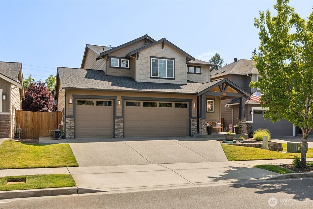 Spacious and thoughtfully designed Hunter Home, this 4-bedroom home offers flexible living with a main-floor den and a cozy family room featuring custom built-ins around the fireplace. The kitchen is well-equipped with stainless steel appliances, a gas range, a large island, and granite countertops. Enjoy year-round comfort with central A/C. A charming mudroom adds convenience, while the 3-car garage includes a roll-up rear door leading to the fully fenced yard space. The covered deck with a built-in gas fireplace is perfect for outdoor gatherings with extended covered patio area. Meticulously maintained with quality finishes throughout. Close to I-5, JBLM, Costco, and more!