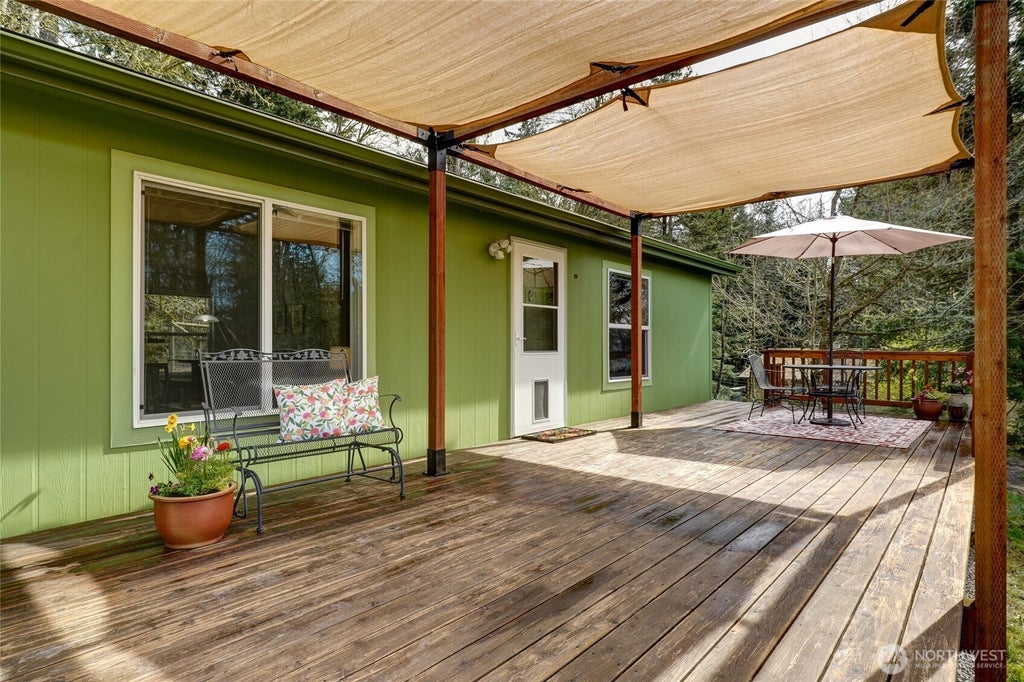 Turn off the main road onto a peaceful dead-end road and feel your stress melt away. This immaculate manufactured home, nestled on 1.25 gently rolling acres, offers ultimate privacy and delightfully abundant bird life. A fully fenced 1-acre front yard ensures your gardens stay deer-free while a 32 gal/min well produces ample sweet water for all your needs. Step onto the expansive west-facing front deck and savor breathtaking sunsets over treetops. A stylish sunshade graces the deck, expanding your living space. This home perfectly blends indoor comfort with outdoor tranquility - your dream lifestyle awaits! With 3 spacious bedrooms, 1.75 baths, a bright great room, laundry room, and ample closet space in every bedroom, this home has it all!