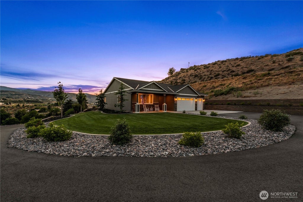 Welcome to your peaceful retreat in East Wenatchee's stunning countryside. This beautifully maintained modern rambler sits on over 2 acres with expansive mountain & river views & custom touches throughout. Step into a bright, open-concept layout featuring vaulted ceilings, quartz countertops, a large kitchen island & stainless steel appliances. The spacious primary suite includes a luxurious en suite bath & walk-in closet. Two additional bedrooms & a full guest bath, this home has it all. Enjoy the outdoors year-round from your covered back patio, overlooking rolling hills and wide-open skies perfect for entertaining, relaxing, or soaking in sunsets. Room for a shop!