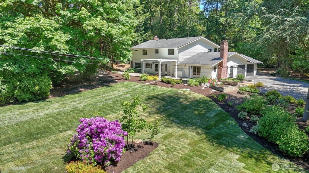 This updated two-story colonial blends timeless charm w/modern elegance in desired Bridle Trails. The remodeled kitchen & bathrooms showcase high-end finishes, complementing rich hardwood floors throughout, shiplap accents, wainscoting, & stylish fixtures. Sunlit living & dining areas feature generous windows, while the spacious primary suite offers French doors leading to a private deck. Chef's kitchen with S/S high end appliances & the spacious family room flow seamlessly to the patio. A main floor den w/a closet & half bath adds versatility. Nestled on 1.2 acres w/western exposure, enjoy park-like grounds w/irrigation, a sprawling lawn, an entertainment patio, & lush garden beds. Top-rated Bellevue Schools & just minutes to DT Bellevue.