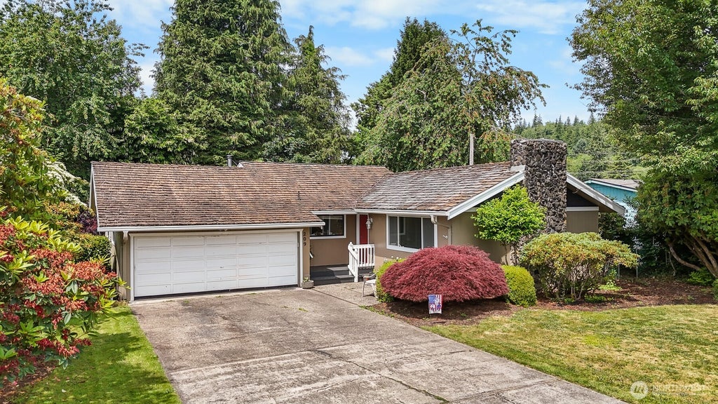 Charming 3 bedroom, 2.25 bath home that boasts 1,606 sqft, and a beautifully landscaped yard. Separate utility room off of the kitchen which also leads into the two-car garage. Two fireplaces and radiant heat. Updated walk-in shower in the full bath. Large rhododendrons lining the fence line welcomes you home, while the backyard offers trees and shrubs as privacy from neighbors giving a hidden oasis feel, perfect for relaxing. Complete with a garden shed, hot tub and large deck off the back of the house making it a great space for entertaining! Bring your creative ideas to life and finish the minor updates that were started here!