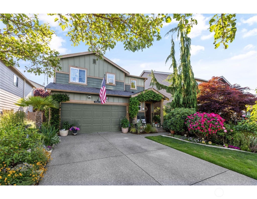 Enjoy direct views of Mount Rainier from your front door. Located in a secure gated community featuring neighborhood parks. Inside you'll find upgrades, including new flooring, modern light fixtures. The kitchen features a generous pantry & updated appliances, while the large covered deck and mature landscaping create a backyard oasis. Primary bedroom includes a walk-in closet. Home offers 2.25 bathrooms—two full baths upstairs & a half-bath on the main level. Pellet stove is a backup source of heat that can heat the entire home. Garage has 220 AMP. Home has recessed lighting throughout and is equipped with a Ring security system. The well-maintained greenery surrounding the property reflects years of love & care throughout home and garden.