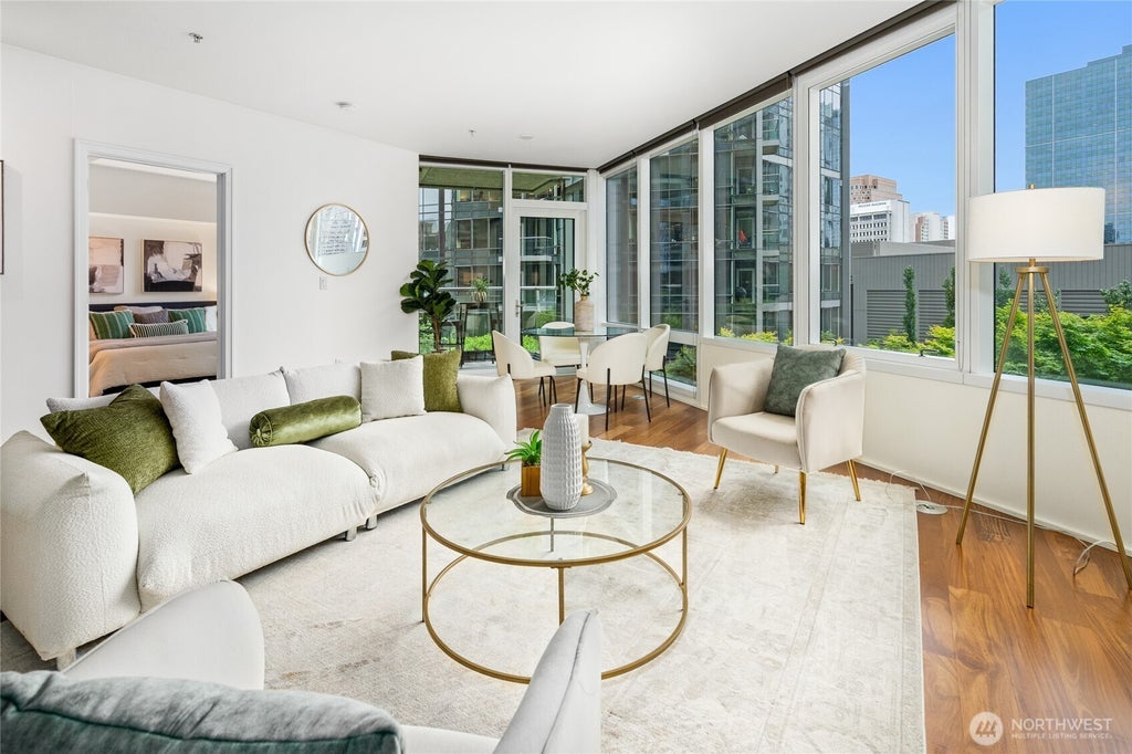 Experience modern luxury in this bright & spacious Bellevue Towers condo. Flooded with natural light from floor-to-ceiling windows, this open-concept home features gorgeous hardwoods, a contemporary chef’s kitchen with granite counters & high-end appliances, plus a private balcony with tranquil views of the gardens, gas BBQ hookup & peak-a-boo water views. King-size primary suite boasts a spa-inspired bath & generous walk-in closet featuring California Closets. Includes spacious utility room with abundant storage. World-class amenities boast rare 24/7 concierge, fitness center, spa, theater, game room, guest suites & enormous garden terrace. Just steps to parks, dining & shopping. Bonus value-add includes deeded storage unit & EV charging!