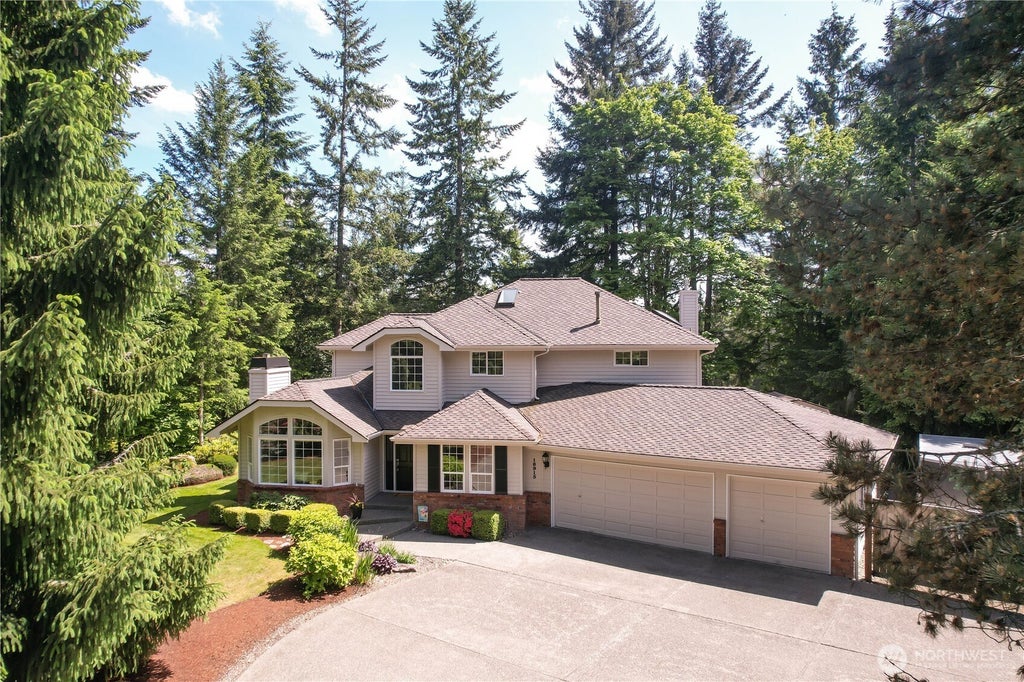 Impeccable 3-bedroom home plus downstairs office/bedroom, full of natural light in sought after Winterwood Estates. This park-like, private shy acre is surrounded by trees & lush landscaping on a quiet cul de sac. A 2-story foyer welcomes you inside to hardwood floors, vaulted ceilings, 2 gas fireplaces & large wood-wrapped windows. The kitchen is updated with stainless appliances, quartz & granite countertops, convection double oven/micro & walk-in pantry. Entertain on the spacious deck or relax by the firepit. Master bath has heated floors, pedestal tub, dual vanities, glass shower & walk-in closet. Convenient 2nd floor laundry. Oversized 3 car garage +RV parking. Newer furnace, water heater & AC. Generator hookup panel & 2 storage sheds
