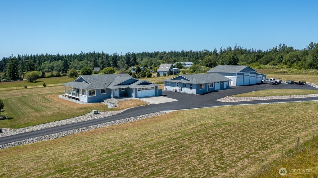 Dreams do come true! Immaculate custom-built 2,378 sq ft rambler perfectly set on 4.86 beautiful pastoral acres w/stunning Cascade Mountain views! PLUS a 1,200 sq ft detached ADU w/toy garage & office, a 1,680 sq ft RV shop w/attached 1,036 sq ft workshop. The paved circular driveway w/easy turn-around & plenty of parking! RV full hookups & automatic propane generators for both homes. Main hm: light & bright open floor plan, vaulted great rm w/gas fireplace , engineered hickory hardwood floors, fresh paint, new carpet, custom hickory cabinets, granite & quartz countertops, expansive island, SS appliances. Covered Fibrin deck w/aluminum & glass railing. North end, close to beaches, state parks, and hiking trails. Camano—the no ferry Island!