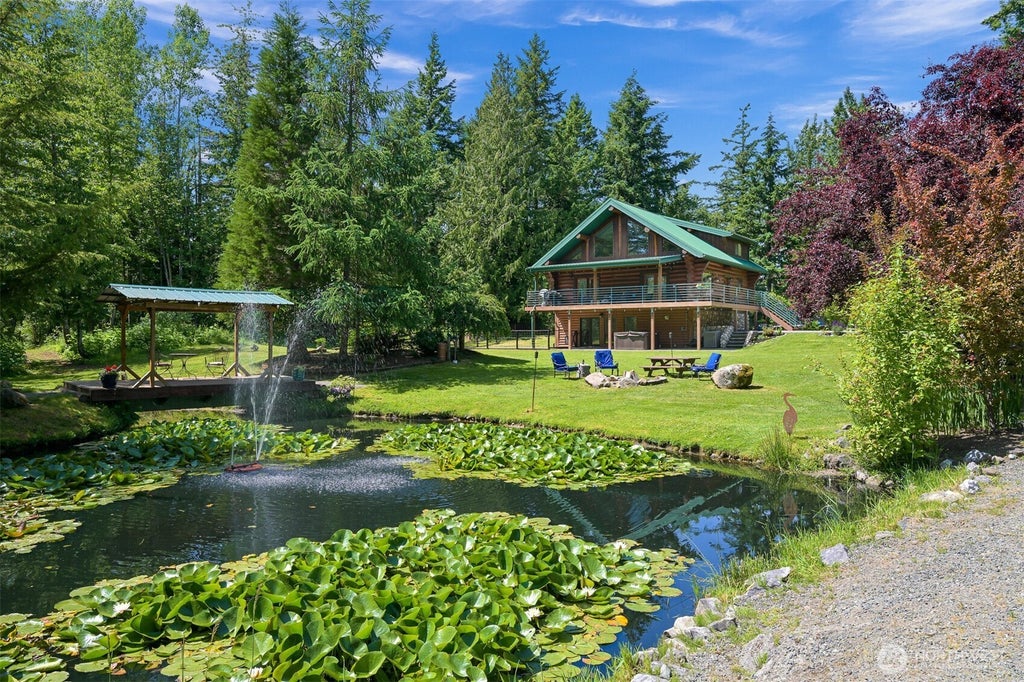 Tucked at the end the private drive, this custom log-style home is a rare blend of rustic charm & modern comfort. Set on 5 park-like acres w/winding trails, footbridges, & a picturesque pond, this property feels like your own private resort.Step inside to soaring vaulted ceilings. The newly updated kitchen is a true showstopper w/quartz counters, stainless steel appliances, & islannd. New solid core doors add a touch of luxury throughout. With 3 bedrooms, each w/its own bath, there’s room for everyone. The impressive 3 bay-36’ x 80’ shop offers room for all your tools, toys, & hobbies. Enjoy overlooking the pond from the covered deck or hot tub & don't forget the tree house that could be a yoga or art studio...Plus the .25 mile of trails!