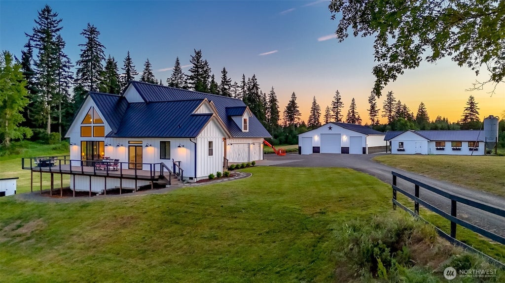 Majestic Mt Rainer views from this beautiful modern farmhouse can be yours. This 11+ acre property offers a spacious 3 bed 3 bath plus an office home, repurposed milk parlor with water and power, 48x80 3 bay shop, full RV hook up and garden shed surrounded by pastures, fruit & nut trees with peace and serenity everywhere you look. The home boasts a chef's kitchen, office, large utiltity room and primary bedroom w/5 piece bath on the main with 2 additional bedrooms full bath and great room upstairs. The 3 bay garage is extra deep w/a mini split. The milk parlor is ready for any use with water, power, heat and washer/dryer hook up. One of the shop's bays is a drive through! The garden shed is just adorable. Too much to list. You must see it!