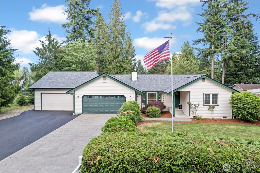 Peaceful rambler on large lot, loaded with comfort features & impeccable quality. Including Circulating hot water, generator, whole house surge protector, propane stove, heat pump/AC, pull-out kitchen shelves, sprinkler system, fenced garden area, ADA bathrooms. 1-3 yrs new: roof w/45 yr warranty, gutters w/leaf guard, appliances, water htr, generator, windows, paving, french drains (no mud). 2 insulated double garages= 1,234 sf of garage space, 1 w/heat & could be converted to living space or add'l primary suite. Covered Patio, shed, carport, RV parking. Peek view of Mt Rainier. 1-owner pride, Well-maintained, Pre-inspected! No HOA. BL schools. Ask for list of full features & upgrades! This home is worry-free & comfort filled.