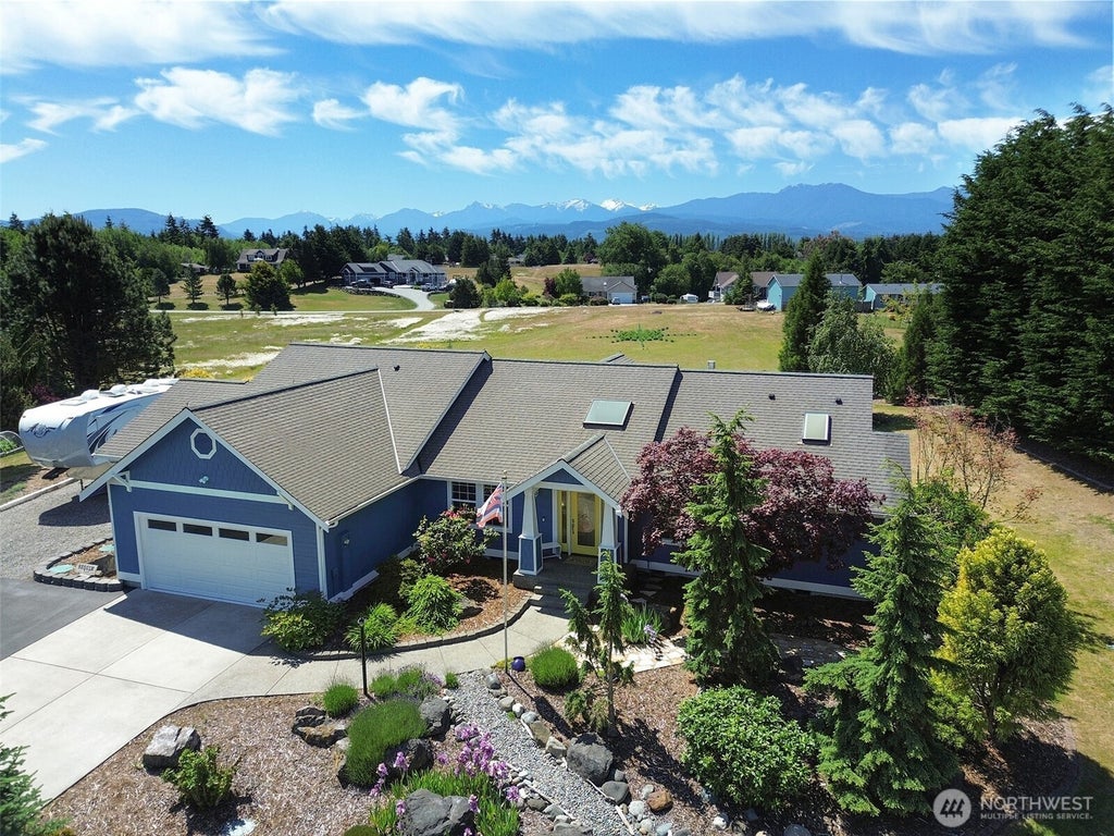 Southern Olympic Mountain views - Quality Custom Home - Beautifully landscaped 1Acre - A few mins walk to the Dungeness Wildlife Refuge w/miles of trails & beaches. This home & property has it all. The updated residence features a spacious main bedroom w/a fireplace, an ensuite w/radiant floor heating, & a walk-in closet all on the west side. The two guest bedrooms & full bathroom are on the east side. The living-kitchen area captures the stunning views of the Mts. & landscaping across the private patio & waterfall feature. The office & a bonus room are just off the entry, for a total of 2244sq'. Red Oak Flooring. The pristine garage boasts an epoxied floor, storage, a shop room, wired for generator hook up to panel & a wine cellar. RV Stn