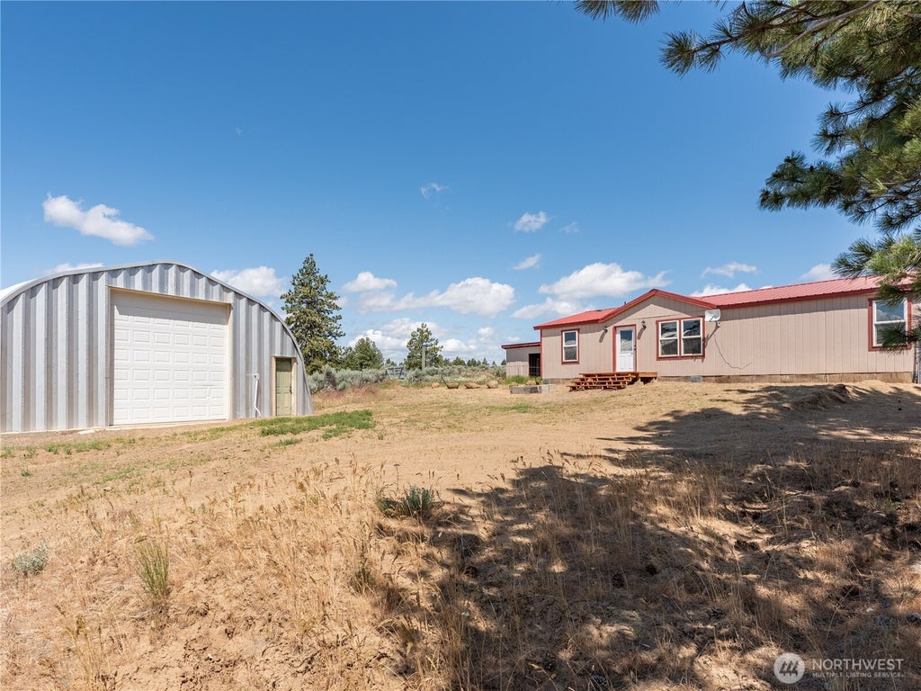This captivating property offers space, comfort and storage galore! With a 1212 sq ft (4 car) detached garage and a 1700 sq ft Quonset hut shop you can bring your cars, toys and projects! The 1321 sq ft manufactured home features updated doors, windows, interior and exterior paint, roof, LVP flooring and cabinetry. The well is shared and produces 27 GPM. Bring your animals too! There is a small barn for storage. The views are amazing. Come and enjoy the serenity of this beautiful home and property.
