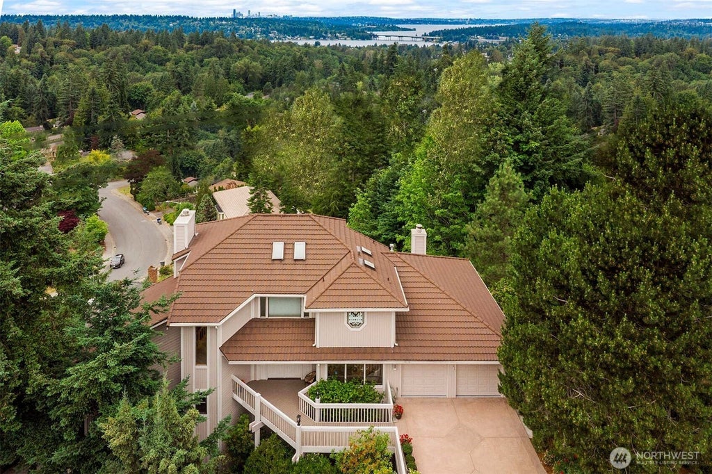 Perched to capture sweeping views of Lake Washington, city skylines, and the Olympics, this custom-built 5BR/4BA Somerset gem—on the market for the first time—rests on a rare 15,000 SF lot with ADU potential. Ideal for multi-generational living, it features new flooring, fresh interior/exterior paint, quartz countertops, and all-new kitchen appliances. Vaulted ceilings and abundant natural light enhance the living and family rooms. Main-level den; upstairs primary ensuite with an additional bedroom; lower-level ensuite, bonus room with wet bar. Epoxy garage floor, durable metal roof, and A/C. Located in Bellevue’s top-rated school district—this is a rare opportunity!