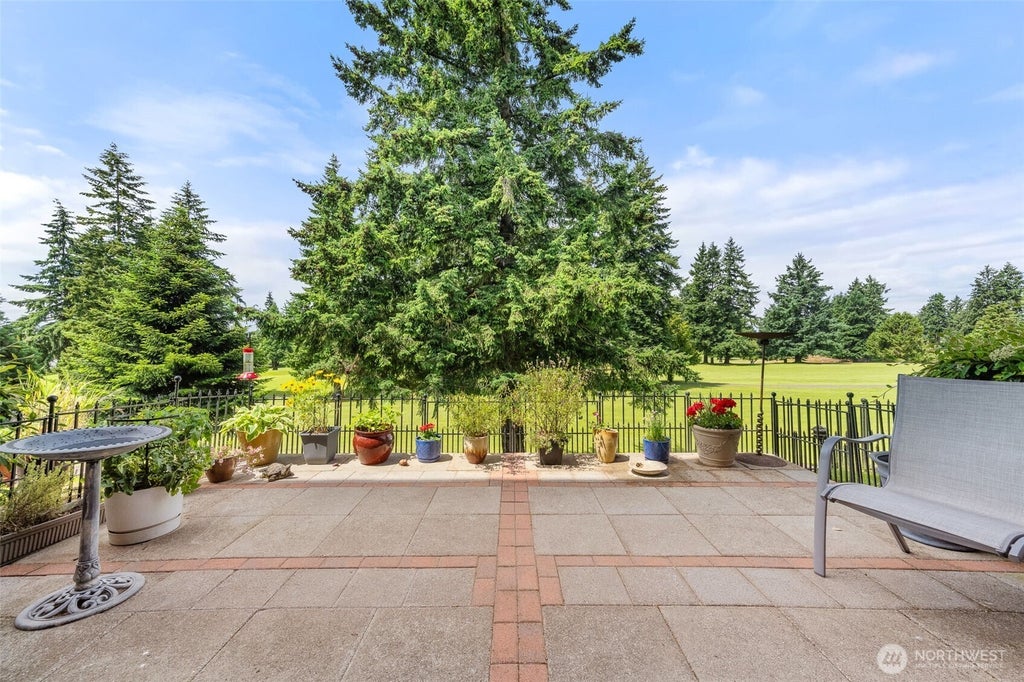 Charming first floor view condo at Allenmore East. Clean & tidy unit with an oversized walk-out patio overlooking the 6th hole at Allenmore Golf Course. Sunny Western exposure provides abundant natural afternoon and evening light. Well-appointed interior offers hardwood floors, and a spacious great room with gas FP and slider doors to the patio. Primary suite features a walk-in closet and private bathroom. Convenient 2nd bathroom and guest room, or in home office space. In unit laundry room with included W/D. New water heater and toasty radiant heated floors throughout. Well maintained & secure 3-story building. Secure common parking garage, lobby, fitness room and individual storage units. No stairs!