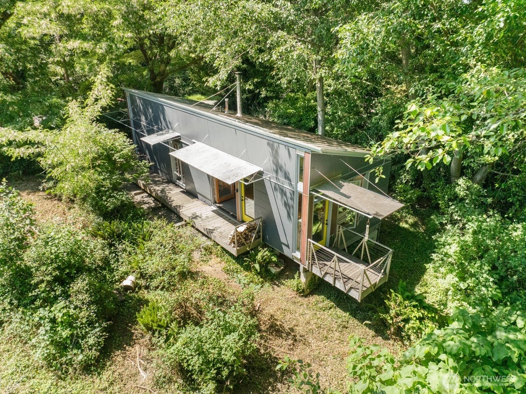 Tucked away on a secluded, wooded lot, this Northwest contemporary cabin offers a peaceful retreat just moments from the Vashon/Fauntleroy Ferry terminal. Currently a thriving short-term rental, this 1-bedroom gem features an elevated sleeping loft accessible from a ship ladder, durable metal roofing, and a mix of cement and wood plank flooring with radiant heating. Warm natural wood trim and clear fir wood windows frame the surrounding greenery, while the galley-style kitchen containing flows into a cozy dining area. Wide double doors open to a covered deck—perfect for morning coffee or evening relaxation. A charming danish woodburning stove and sleek stainless steel appliances complete this enchanting woodland escape.