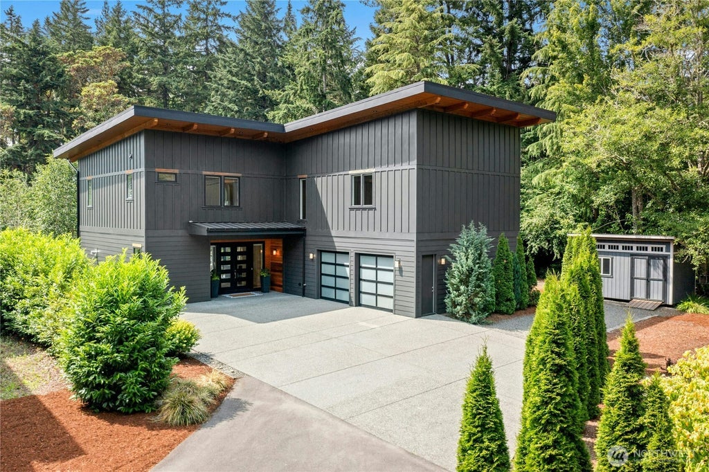 Timeless architecture meets modern sophistication. Situated on sun-soaked .85ac, this home features 10ft lofted ceilings, expansive windows & seamless indoor-outdoor flow. Each bdrm offers a private en suite, including a main-level guest w/custom Murphy bed for effortless hosting. The primary suite is a sanctuary w/ private deck, spa-inspired bath & spacious closet. A premium Bertazzoni range/refrigerator anchors the kitchen for elegant & gourmet meals. Outside, a curated garden surrounds the home w/ stone paths, mature fruit trees & multiple seating vignettes. Host w/ ease; grill in the backyard, screen a film under covered patio, or unwind fireside beneath stars. New metal roof + siding ensure beauty & longevity. This is BI at its best.