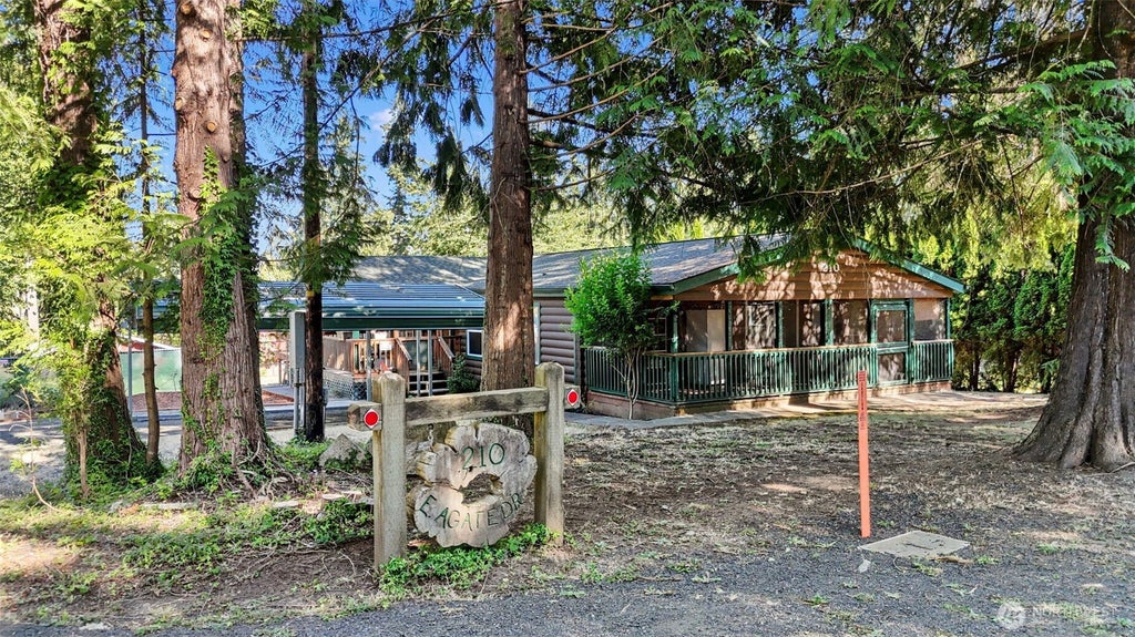 Charming & unique log sided manufactured home nestled in the beautifully forested Timberlakes community. This well designed 3bed 2bath home features two covered porches (1 fully screened) and two-tier deck leading to gazebo overlooking spacious fully fenced & private back yard. Inside you'll find a recently remodeled, naturally skylit kitchen with gas stove and intentionally designed kitchen island with granite countertop and abundant storage. Primary bedroom and ensuite are privately situated away from other bedrooms. Recently updated luxurious plank flooring. Community amenities include exclusive access to lakes, beaches, docks, boat launches & parks. Plus private saltwater access & boat launch to Pickering Passage. Come see today!