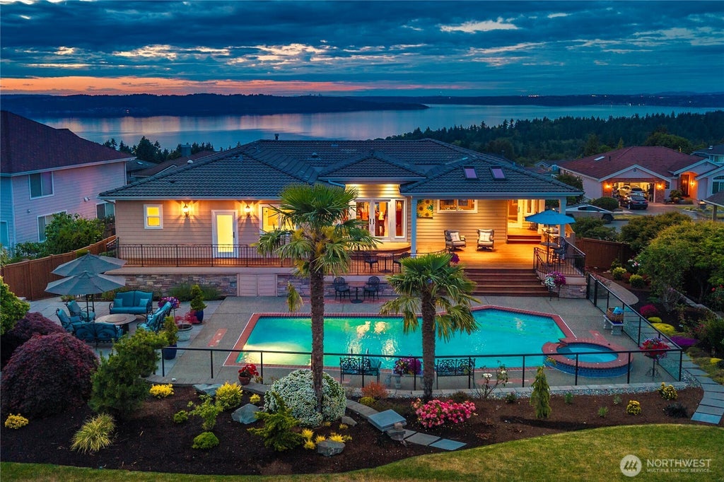 Refined luxury in this exquisite Sound & mountain view home where every detail is designed for comfort, elegance, &d seamless indoor-outdoor living. Whether hosting or enjoying quiet evenings, this home offers the perfect blend of sophistication/relaxation. Entertainer's dream backyard complete w/low-maintenance sparking pool, hot tub, outdoor kitchen under a spacious covered porch. Gourmet kitchen w/top-of-the-line appliances. Primary suite boasts timeless elegance & comfort w/rich travertine tile, dual vanities, soaking tub & fireplace. Enjoy movie/game night in dedicated TV room w/built-in sound, custom fireplace, wet bar. Possible 4th bed LL. Exceptional home brimming with quality, character, and custom craftsmanship that sets it apart.