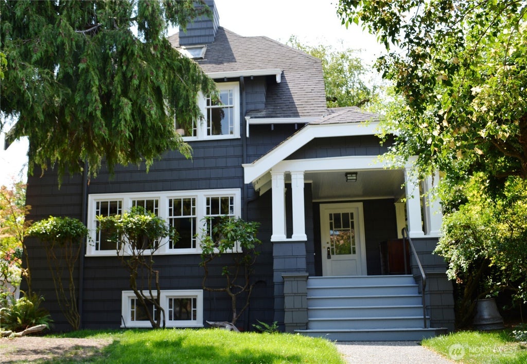 Classic 1917 Craftsman in the heart of Ravenna, blending historic charm with thoughtful updates. Original oak and fir floors, rich crown molding, leaded glass built-ins, and natural fir trim create warmth throughout. Spacious living and dining rooms flow beautifully into the main floor layout. Upstairs offers three large bedrooms and a full bath. Bonus third-floor retreat perfect for office, playroom, or creative space. Fresh paint in and out, refinished floors, new carpet, updated bath, inviting landscaping. Enjoy peaceful mornings on the front porch and sunsets from the private rooftop deck. Fully fenced backyard, sun-drenched garden space, and detached garage complete this special home—just blocks to Ravenna Park, light rail, and cafés.
