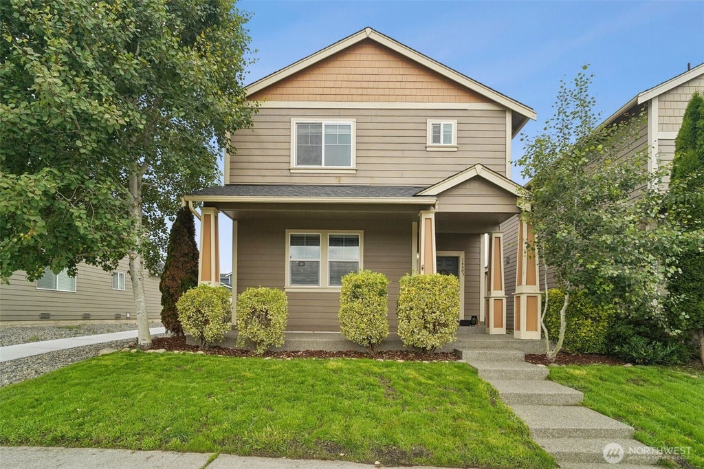 Welcome to your modern 3bed/2.5bath home in the friendly Tahoma Terra neighborhood. With a low-maintenance front yard, you’ll have more time to enjoy the park and play area just across the street. The spacious open-concept living and kitchen area is ideal for entertaining, while central A/C keeps things cool. Upstairs, the private primary suite has it's own bath and a walk-in closet, and the two secondary bedrooms share a full bath with a convenient upstairs laundry. Beyond the kitchen you'll find a large two car garage and driveway in the back for owner parking + ample street parking out front for guests. Just 30 minutes to JBLM, and 9 minutes to the local grocery store, enjoy the small town feel with local conveniences. Virtually staged.