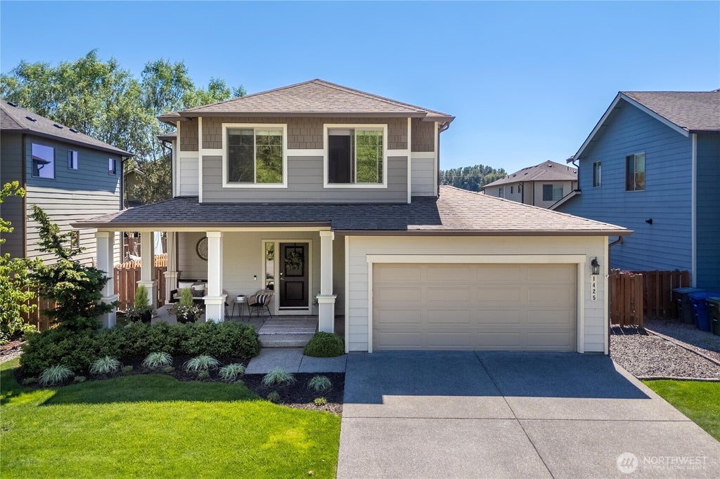 Welcome to this beautifully upgraded home in Perkins Prairie featuring brand new laminate hardwood flooring, newer paint & more custom details. The open-concept layout offers a bright kitchen with quartz counters, full-height backsplash, large island with storage, and stainless appliances included. The spacious dining area opens up to the great room which features a cozy gas fireplace with custom built-ins. Upstairs you'll find a large loft, primary suite with walk-in closet and 5-piece bath, two additional bedrooms, full bath, and laundry with extra storage. Enjoy year-round comfort with A/C, a tankless water heater and a 2-car garage. Relax on the covered front porch or back deck overlooking a private, landscaped backyard. A must-see!