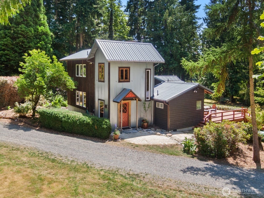 South Whidbey gem on wooded 4.5-acres. Artistically designed home w/ 2 beds, 1.75 baths. One-of-a-kind kitchen, dining area opens to a pizza oven patio, cozy living room w/ wood stove leading to large deck. Primary bedroom w/ ensuite bath & French doors to the deck overlooking the serene landscape. Mini-splits. Upstairs spacious & bright bedroom w/ hidden nook & small bonus room w/ view of the fields. Additional 500 SF living space w/ loft has potential for a private suite attached to the 2 car garage. Down the drive find a 2,500+ SF plumbed & powered workshop, plus a 380 SF powered & heated studio building awaiting your creative endeavors. Mature fruit trees. Just 12 minutes from the ferry, offering space to bring your dreams to life.