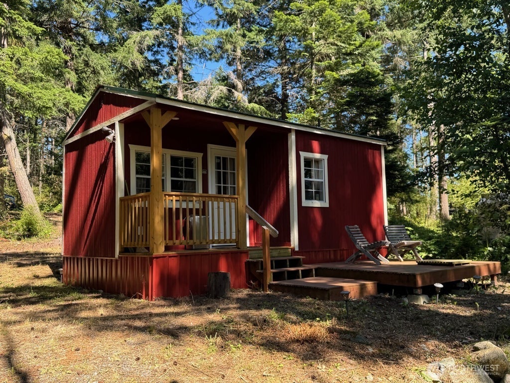 This 3/4-acre property offers a peaceful retreat with beautiful clearings and mature evergreen trees. The newer, tiny home features a Murphy bed, 3/4 bath, and an on-demand hot water heater. The cozy living and dining area leads to a covered porch with steps down to a composite deck, perfect for Adirondack chairs. A charming stone firepit enhances the outdoor space. The septic is rated for a three-bedroom home, allowing you to live in the tiny home while you build your dream home. Enjoy the community's three private beaches, one with a boat launch. Your perfect island getaway awaits! Guemes Island is just a 7-minute ferry ride from Anacortes.
