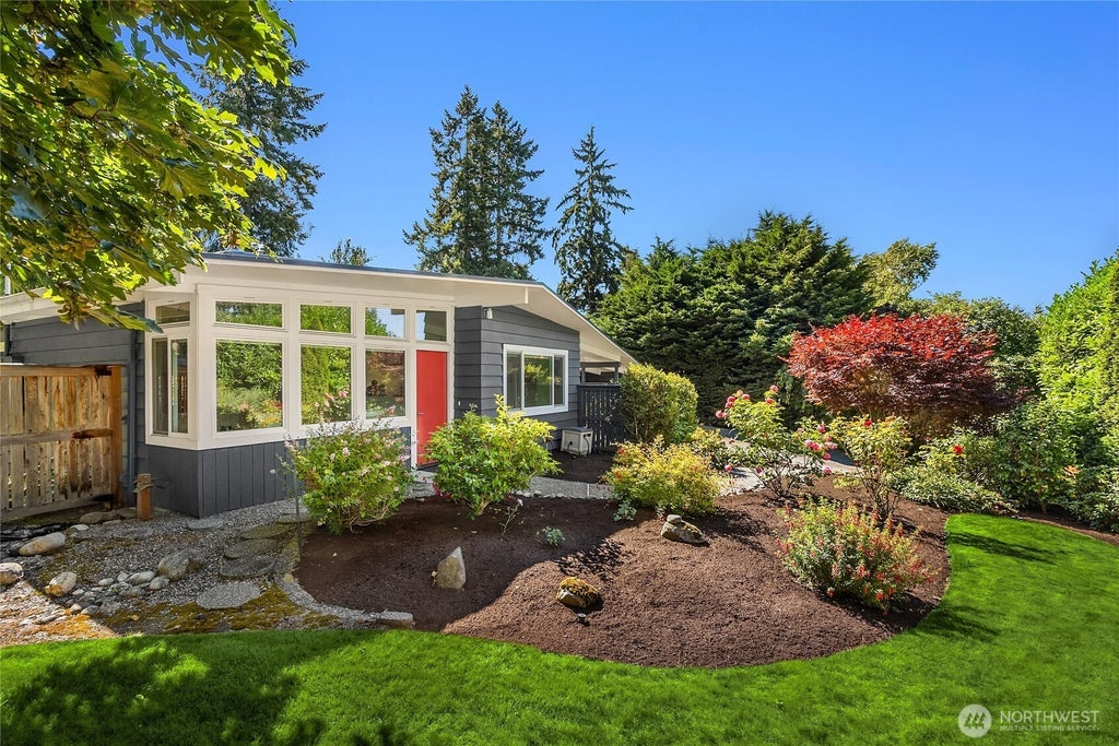 Stunning mid-century modern gem—light-filled, one-level retreat in a serene, close-in location. Renovated in 2015 by Peter Brachvogel, architect and executed by Carley Construction, this home features vaulted ceilings with car decking, skylights, and walls of windows and sliding doors providing a very open feeling. Sleek white-on-white kitchen with quartz counters and high-end appliances, opens to living room, dining room and inviting patio. Expansive primary suite with walk-in closet and luxurious bath, walk-in shower, and dual-sink vanity. Two more bedrooms share a skylit full bath. Maple floors, large laundry, mature landscaping with raised beds, 17-zone irrigation, and abundant storage inside and out. Just minutes to Winslow and ferry!