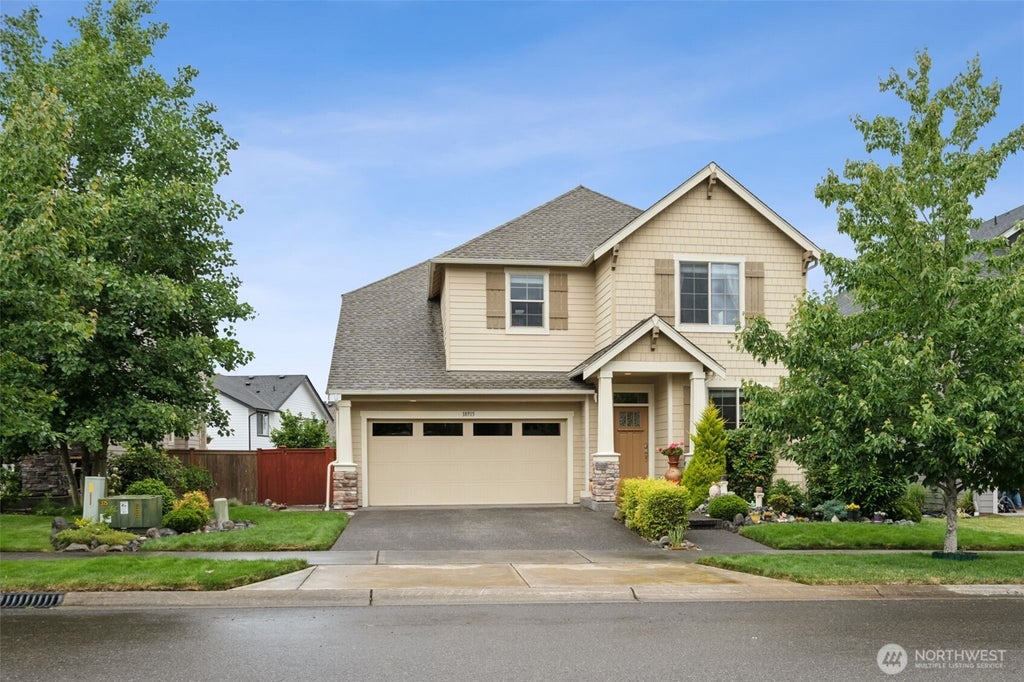 Better than new Lennar resale in the desirable Tehaleh community with newly installed AC! The gourmet kitchen is a chef’s dream, with massive island bar-height seating, full-height backsplash & all appliances stay. A cozy breakfast nook provides the perfect spot for daily meals. Spacious great room W/gas FP. Convenience is key W/bedroom & ¾ bath on the main level as well as a flex space (currently a dining room). Upstairs, is the luxurious primary suite, complete W/ vaulted ceilings, spa-like 5-piece en-suite bath, & generous WI closet. 2 beds & full bath are also upstairs, along W/large bonus room/loft & laundry. Fully fenced backyard W/patio & garden beds. Walking distance to trailhead, school, coffee & dining! Sumner BL School district.
