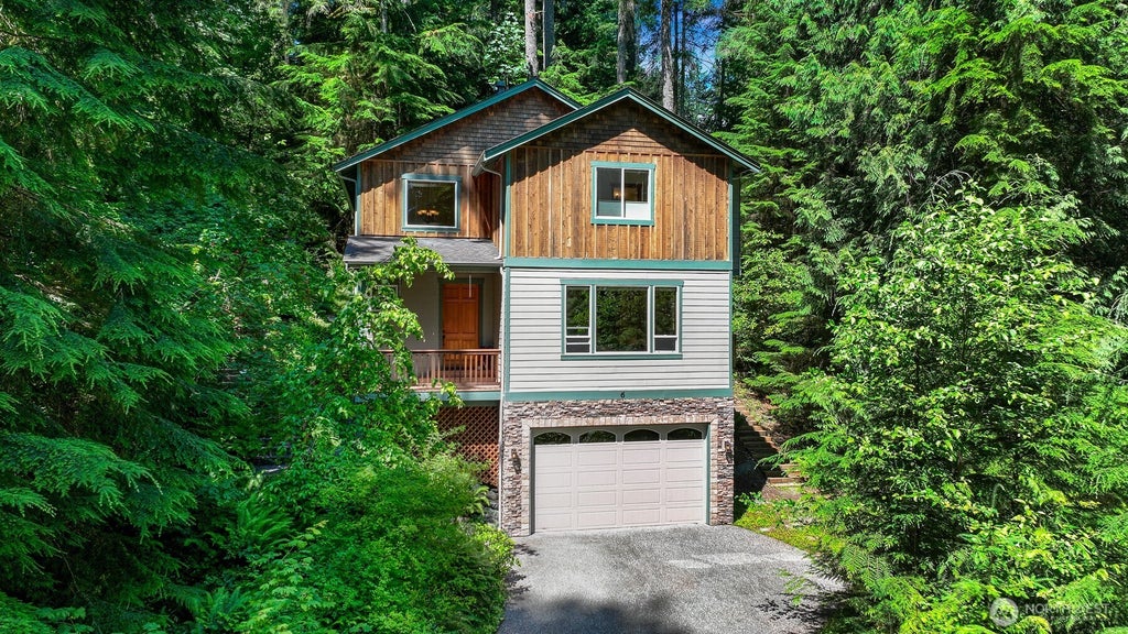 Tucked in the trees of Gate 5, this 2,358 sq ft Sudden Valley home offers privacy, light, and space. Built in 2008, green spaces on both sides and features a main-level bedroom, spacious living room with large windows and hardwood floors, dining area, kitchen, laundry, and half bath. Upstairs, the primary suite includes vaulted ceilings, fireplace, walk-in closet, and a large bath with soaking tub and shower. Two additional bedrooms each have their own sink, Jack & Jill bath, and one has a walk-in closet. Two decks, including an oversized one built for a hot tub, are perfect for entertaining. Close to trails, the golf course, and all Sudden Valley amenities.