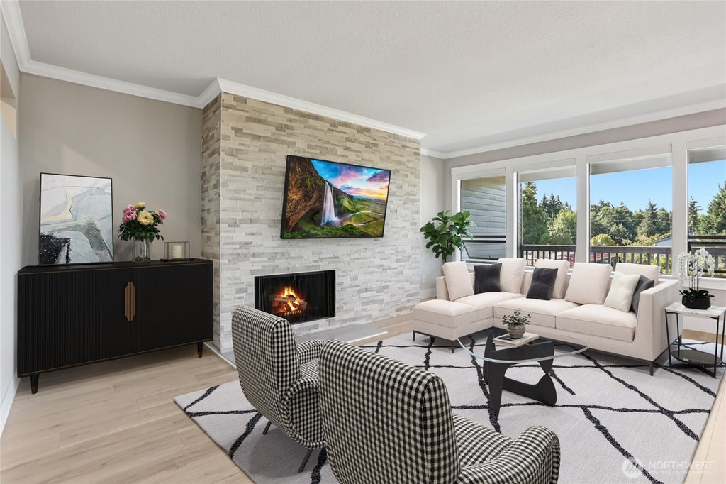 Discover luxury and convenience in this beautifully renovated top-floor end unit condo. Featuring 2 bedrooms and 2 baths, this home offers a sophisticated living experience in an ideal location. A sleek, modern kitchen featuring quartz countertops, an inviting eat-in bar, and custom lighting that adds warmth and elegance. The open layout seamlessly connects to the living area, where a contemporary fireplace creates a cozy ambiance. Enjoy views Juanita Bay from the comfort of your main living area, or step out onto the spacious covered balcony to soak in the surrounding natural beauty. This special condo exudes style and comfort. Don't miss the opportunity to make this exquisite Juanita gem yours!