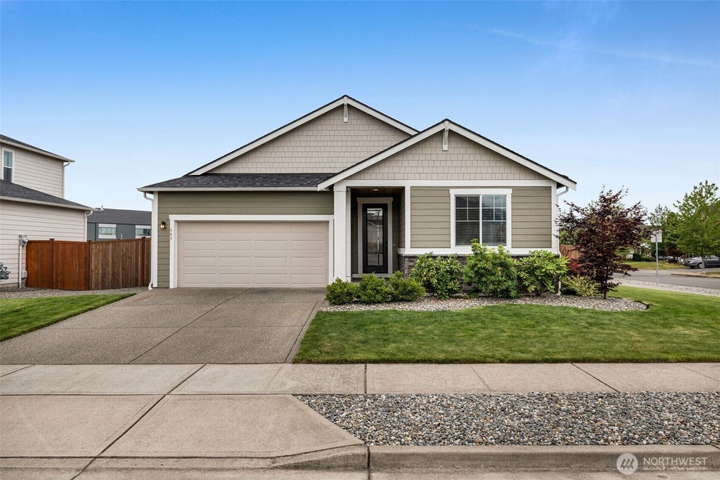 Better than new Richmond American rambler on a huge corner lot! With over $20k in upgrades, this home will not disappoint! Featuring 9ft ceilings & tons of natural light throughout, with open-concept living for a perfect blend of comfort & functionality. Spacious kitchen with stainless steel appliances (yes, they all stay!) & gorgeous granite countertops. Living room features an office nook & huge slider with access to custom patio, perfect for entertaining. 3 bedrooms include a large primary with ensuite & walk-in closet. Upgraded with A/C for warm summer days! Walking distance to charming downtown Buckley, schools, foothills trail, and more, with views of the foothills, this home is ready for you to make it your own!