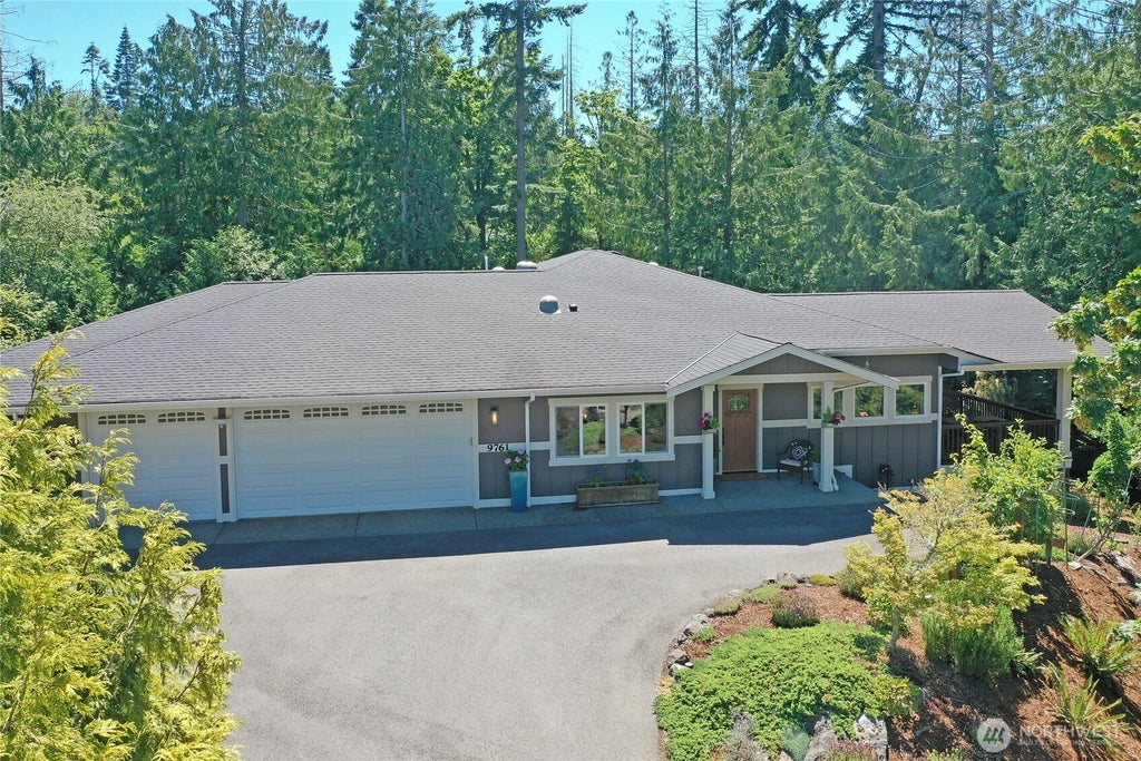 This beautiful private oasis features an ideal ONE LEVEL open floor plan. Ideally sited atop a sunny hill in the desirable Summit at Blakely Harbor neighborhood with 50 acres of trails, common area & playground. Custom built by Wing Point Construction in 2013, this home features a chef's delight kitchen with a sizable island, stainless appliances, and roomy walk-in pantry. The immense living room has french doors that open to a lanai. Enjoy the flexibility of 2 bedrooms, a proper office & studio/den space. You'll love the primary bedroom that opens to sunny patio, garden with raised beds, & a chicken coup. The perfect package in a peaceful, tranquil community, only a short distance to Lynwood Center for shopping, sipping, eating and movies!