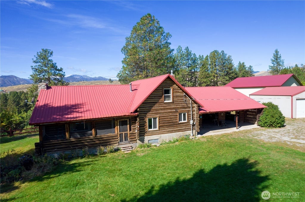 For sale by owner, Vintage authentic log home only two miles from town of Winthrop, 1798 sq feet with 3 bedrooms, spacious living room with exposed overhead beams, with rock fireplace. Attached 2 car carport. Three outbuildings include a 3000+ sq ft shop, 742 sq ft garage and 369 sq ft farm shed. irrigation shares included. mature lawn and trees. Short distance to Pearygin lake and out door excursions.