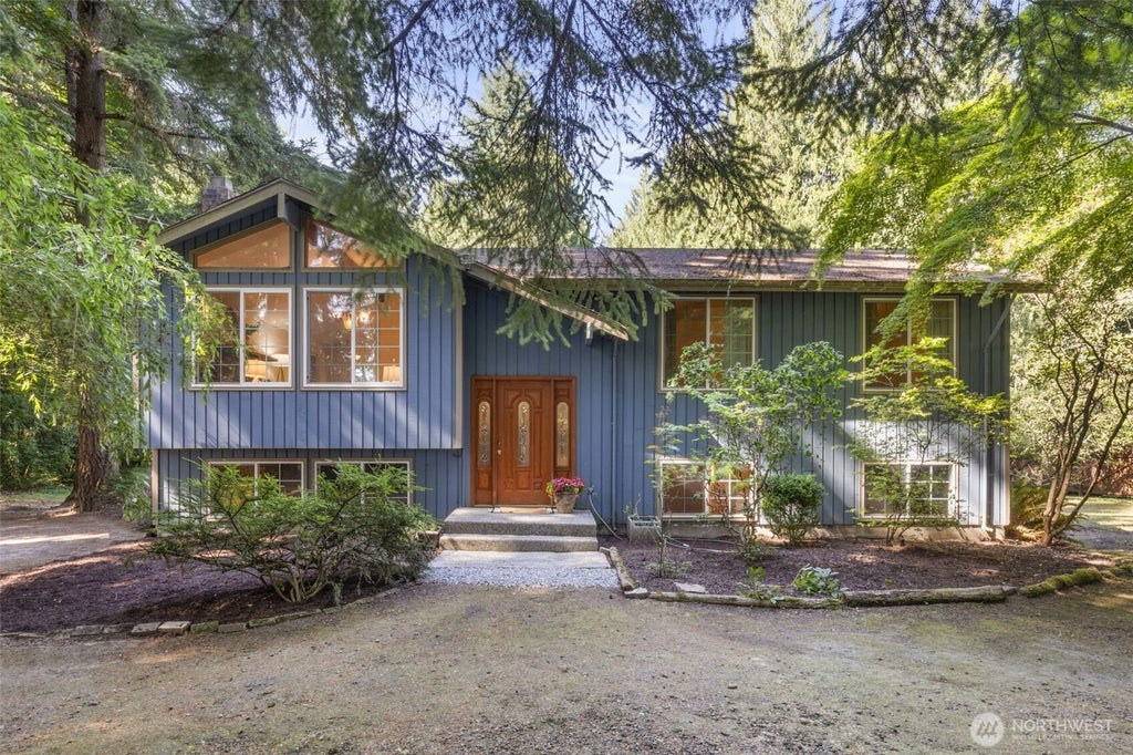 Discover your own private retreat just minutes from town in this serene Poulsbo property nestled on 2 stunning wooded acres. Towering firs and cedars, lush ferns, and meandering trails surround the home, while the sunny backyard meadow offers fruit trees and space to garden, play or relax. Inside, the split-level layout features a vaulted living room with large windows, a cozy fireplace, and views of the trees beyond. The spacious lower-level family room has its own fireplace and walkout access to the backyard. The primary bedroom overlooks the peaceful woods and includes an en suite bath. Two more bedrooms plus additional bonus rooms provide flexible space for work, hobbies, or guests. Tranquility meets convenience here—welcome home!