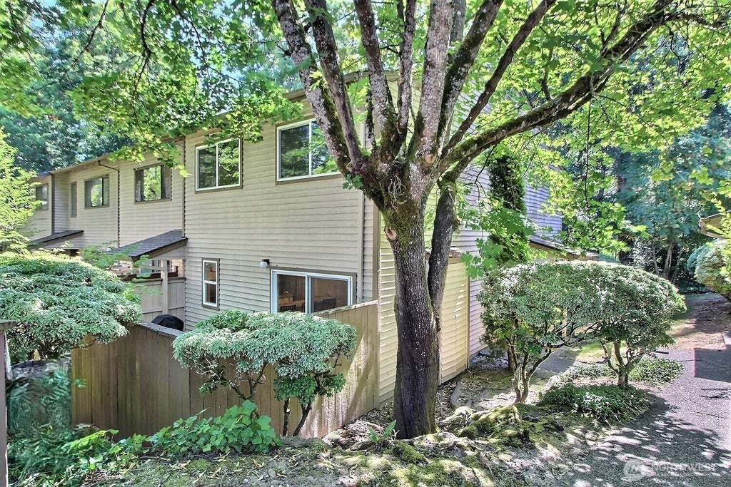 Amazing updated 3bd end unit in a gorgeous, serene woodland setting! Over 1400SF with tasteful updates, fresh designer paint & special touches. Main level boasts warm entry, large living room w/wood burning fireplace & slider to amazing back patio, spacious kitchen w/SS appliances, breakfast bar + dining area w/slider to fenced front 2nd patio & a half bath! Upstairs has a large primary bdrm w/walk-in closet, updated full bathroom featuring a double vanity w/granite countertops. Noteworthy extras include custom blinds, new laminate flooring throughout the main level, new dishwasher, new W/D, & dimmable lighting! Finished garage w/storage, 1 assigned parking space + plenty of guest parking. Prime location close to schools, shopping & more!
