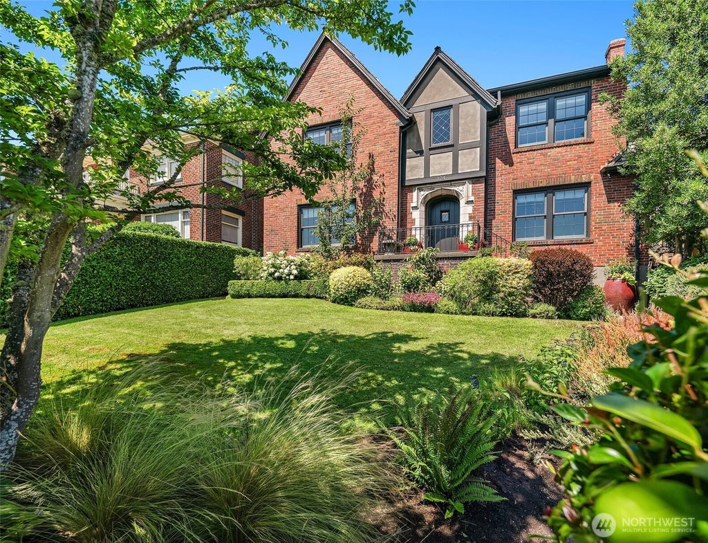 Meticulous & exquisitely renovated half-timbered brick Tudor perfectly perched to capture Space Needle & downtown views from Queen Anne’s highly desirable SW slope. Generous spaces on 3-levels include a masterful addition by Bill Haas, expanding the eat-in kitchen w/ a fplc, built-in benches & French doors opening to a romantic patio. Main floor offers dining, large living room w/fplc & built-in bookshelves. Wrought iron stairs lead to 3 bdrms up including a gorgeous primary suite. Lower level offers an en-suite bath, media room, entertaining kitchen & temperature-controlled wine cellar. Surrounded by lush gardens & hardscape, the patio & garden are a truly sublime escape. Two-car gar off alley, fenced backyard, mature trees & plantings.