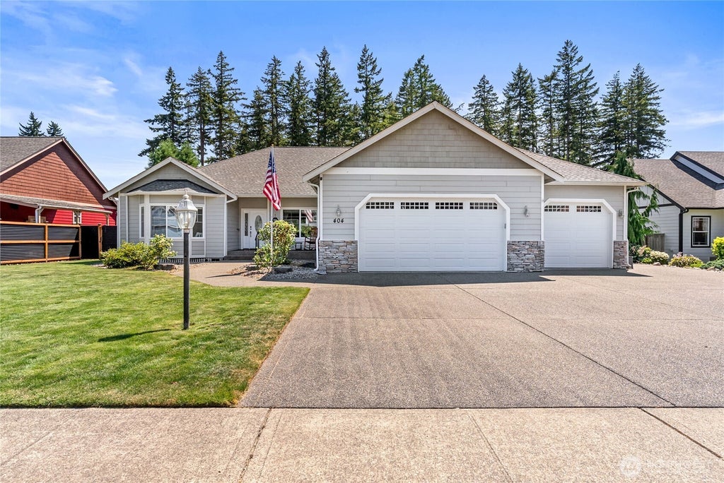 Private. Peaceful. Perfect. This custom-built RAMBLER offers the ideal blend of comfort and functionality on a beautifully landscaped 1/3 acre lot. From the moment you enter the grand foyer, you'll be captivated by the spacious layout and thoughtful design. The well-appointed kitchen offers generous counter space, abundant cabinetry, and seamless functionality. Retreat to the expansive primary suite, featuring a spa-inspired bath and a walk-in closet with built-in cabinetry for ultimate organization. Two additional oversized bedrooms share a full bath, offering space and privacy for guests. A/C, heat pump, RV parking, 3 car garage, sprinkler system, retractable awning, covered patio, wired for generator, HUGE storage shed, minutes to JBLM!