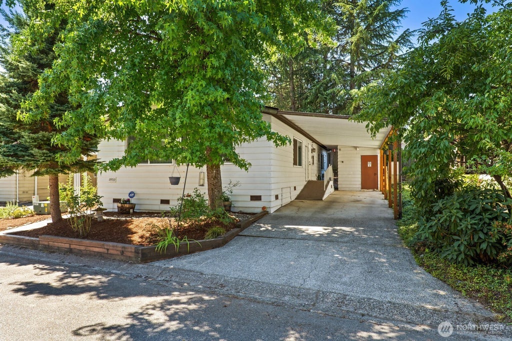 Charming 2 bed, 1.75 bath home in Holly Hills on deeded land (you own the land), located in the sought-after Northshore School District! Features central A/C, Living room with vaulted ceilings. Kitchen with breakfast bar. Dining room with built in china cabinet. Large primary suite with en suite bath, spacious utility room with sink, and a generous covered front porch. 2-car carport included. Community offers a clubhouse, athletic court, and playground. Dues only $25 a month and no age restrictions. Just minutes to 405, 522, and beautiful downtown Woodinville. Don’t miss this opportunity!