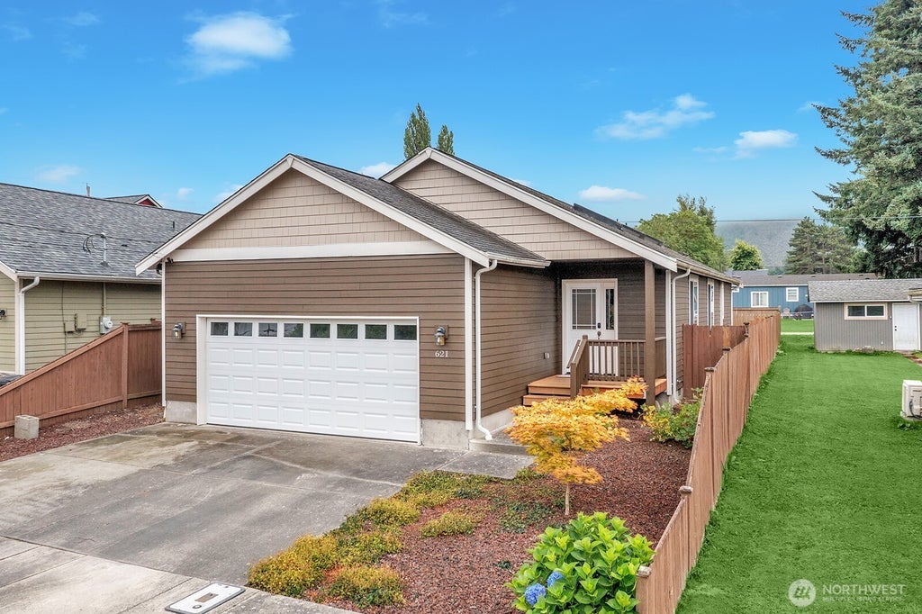 Beautiful 3 bed/2 bath rambler with open-concept living and mini-split heating/cooling in the living area and primary bedroom for year-round comfort. The kitchen features custom wood cabinets, gas range, tile counters, and hardwood floors. Additional highlights include vaulted ceilings, skylights, and real wood millwork. The primary suite offers a walk-in closet and private full bathroom. Other features that complete this well-maintained home include a large laundry room with extra storage, a spacious attached two-car garage, and a fully fenced, generously sized backyard with alley access and peaceful foothill views.